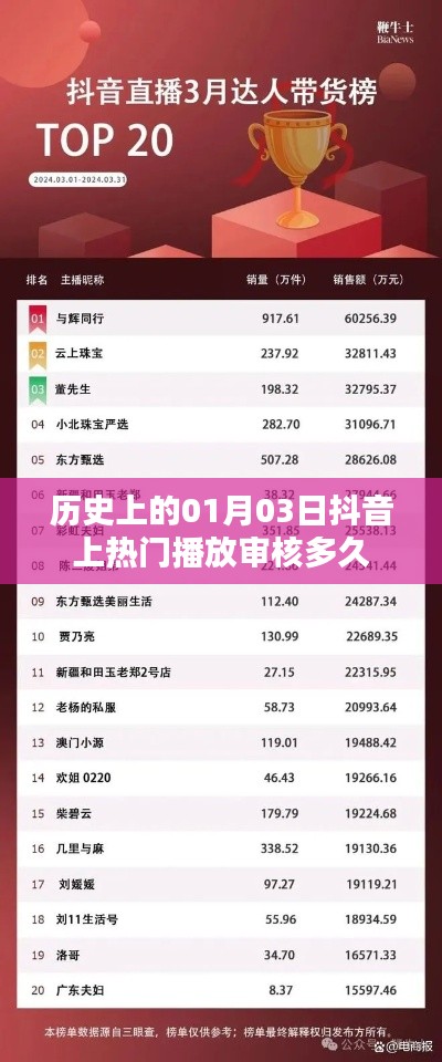 隨著互聯(lián)網(wǎng)的普及和社交媒體的興起,抖音作為一款流行的短視頻平臺(tái),吸引了眾多用戶的關(guān)注,在抖音上,一些內(nèi)容因其獨(dú)特性、創(chuàng)意性或是與歷史的緊密關(guān)聯(lián),常常成為熱門話題,本文將探討歷史上的01月03日這一天在抖音上的熱門播放情況,以及抖音內(nèi)容審核的時(shí)間長度。